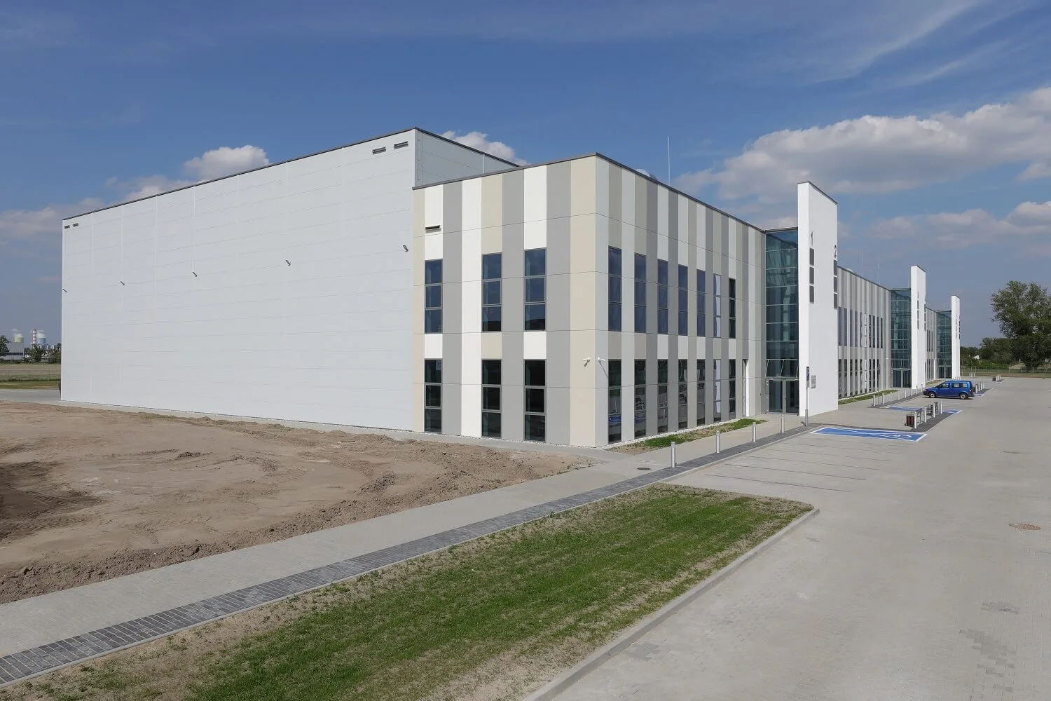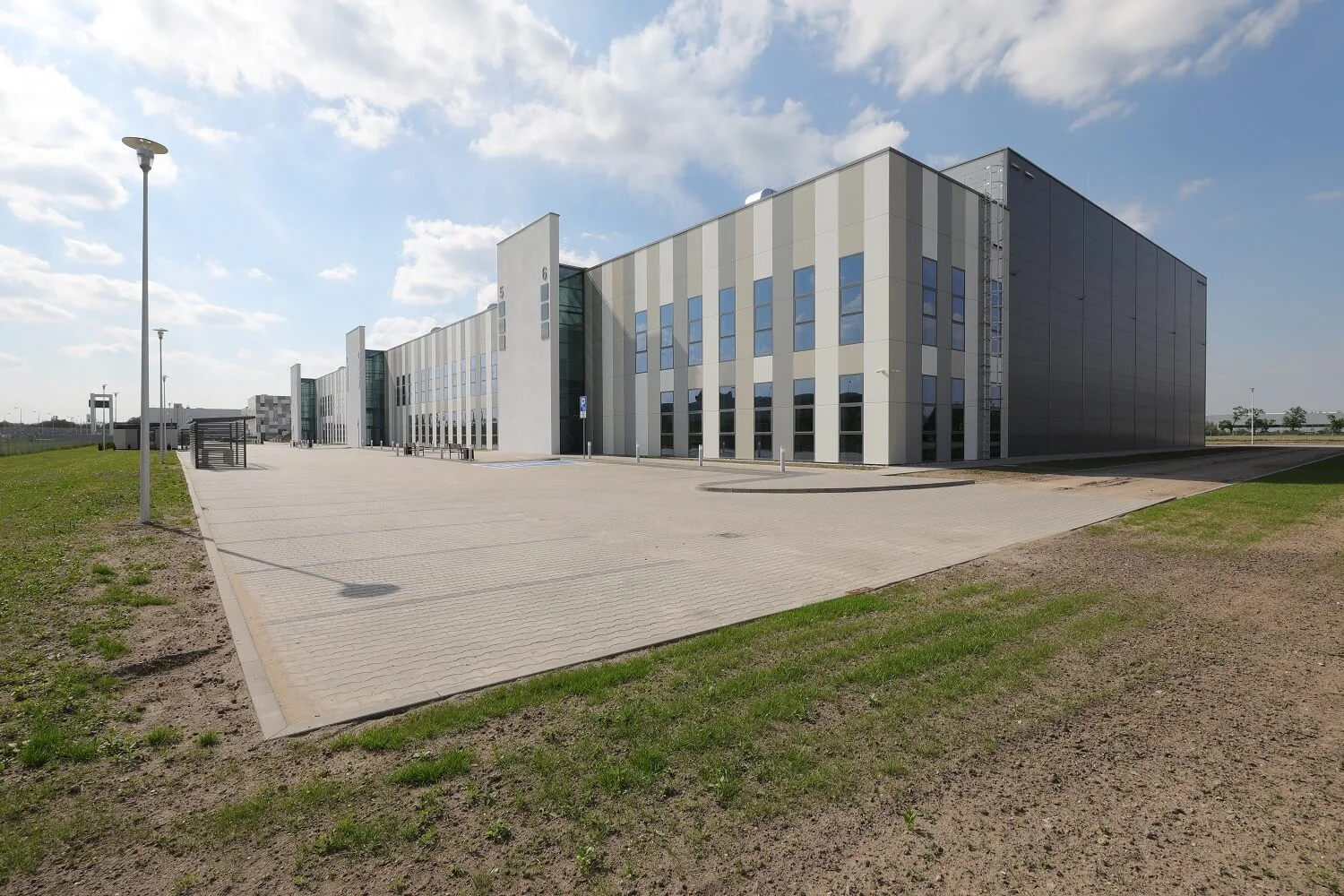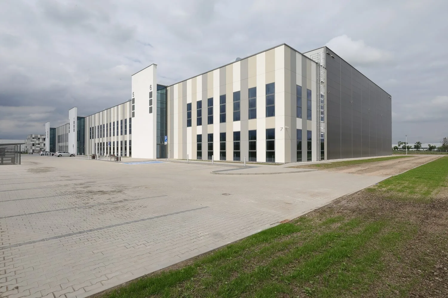Hoone katmiseks kasutati RAL 7035 ja 9007 värvitoonides ARPANELi varjatud kinnitussüsteemiga sandwich-seinapaneele.